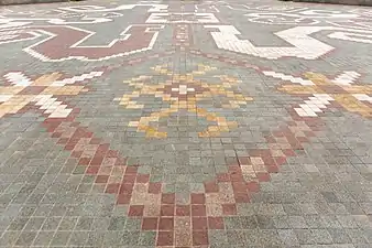 In the center of the pavement there is a narrow oblong rug path decorated with patterns of Armenian carpets. The decoration system of carpets, particularly of “ Chartar” type, characterized by interconnected chains of diamond-shaped large creations is in the base of the rug structure. The main composition of the late period dragon carpet of “Khndzoresk” type is represented. It contains the symbol of the Sun representing the eternal conflict between good and evil and eight stylizations of the Dragon surrounding the Sun. The patterns of the “tree of life” initiated from the Sun symbol represent the victory of good and the idea of eternal life. The linear version of the central sector of the dragon carpet “Guhar” woven in 1680 is in the center of the large diamond-shaped ornament. The corners are decorated with stylized dragon figures typical to the late period-dragon carpets of “Masyatsotn” type, and with stepped diamond-shaped patterns typical to “Chartar” type carpets.