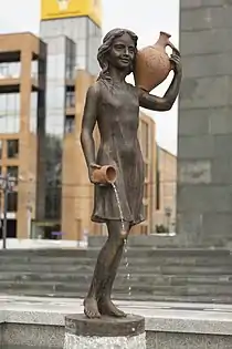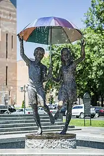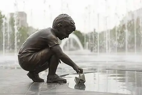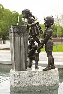 Seven bronze statues are installed in the park which were ordered and created especially for the Yerevan 2800th Anniversary park. The entrance of the park is decorated with bull and lion bronze statues made by analogy with the frescoes of Erebuni fortress. In four corners of the fountain which has the form of the map of Yerevan there are four bronze statues of children (“Imagination”, “Caring”, “Chastity”, “Happiness”), as well as there is a statue of a child with a boat (“Childhood”) on the site symbolizing the Yerevan lake. The statues represent the images of children of Yerevan city of the 1970s and 1980s.[9]