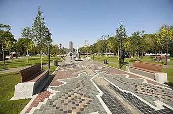 - At the end of the park there is Alexander Miasnikian’s statue (sculptor Ara Shiraz, architect Jim Torosian), erected in 1980. Anyway, Alexander Miasnikian’s statue has no connection with the Yerevan 2800th Anniversary Park, which is under the jurisdiction of Yerevan Municipality. The statue is maintained by the Ministry of Culture of Armenia.