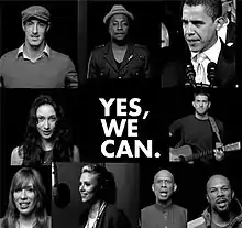The music video was released on Dipdive.com and also on YouTube.com under the username 'WeCan08'.[11] It was honored with the first-ever Emmy Award for Best New Approaches in Daytime Entertainment.[12] The video is a collage-style music video inspired by Barack Obama's popularization of the slogan "Yes we can.", which became a secondary slogan for his campaign. During the 2008 US presidential campaign following the New Hampshire Democratic Primary, then-Senator Barack Obama, used the similar English translation of the slogan of United Farm Workers (UFW) – "Sí, se puede" (Spanish for "Yes, you can" or "Yes, it can be done") in his speech. The slogan dates back to 1972 when Cesar Chavez and the UFW's co-founder, Dolores Huerta, came up with the slogan during Chavez's 24-day fast in Phoenix, Arizona.[13] The music video premiered on television on ABC News Now's What's the Buzz entertainment program on February 1, 2008.[4] On February 2, 2008, it was featured on the Obama campaign's community blog,[14] and later promoted as a viral video by the campaign on its website.[15] The clip was played prior to a February 12, 2008, campaign rally of nearly 20,000 at the Kohl Center on the campus of the University of Wisconsin–Madison. The video was edited by Terence "Biff" Butler of Rock Paper Scissors, and executive producers included will.i.am, Mike Jurkovac, Fred Goldring, Jesse Dylan, Priscilla Cohen and Sheri Howell and Lilo. Associate producers included Sean Larkin, Sarah Pantera, Carol Cohen, Steve Koskie, Wendi Morris, and Scott Spanjich. The following celebrities were featured in the video:[16]