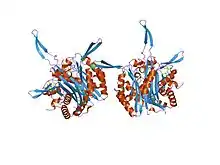 MECDP (2-C-methyl-D-erythritol 2,4-cyclodiphosphate) synthetase, an enzyme in the non-mevalonate pathway of isoprenoid synthesis, isoprenoids being essential in all organisms. Isoprenoids can also be synthesized through the mevalonate pathway. The non-mevolante route is used by many bacteria and human pathogens, including Mycobacterium tuberculosis and Plasmodium falciparum. This route appears to involve seven enzymes. MECDP synthetase catalyses the intramolecular attack by a phosphate group on a diphosphate, with cytidine monophosphate (CMP) acting as the leaving group to give the cyclic diphosphate product MEDCP. The enzyme is a trimer with three active sites shared between adjacent copies of the protein. The enzyme also has two metal binding sites, the metals playing key roles in catalysis.[2]