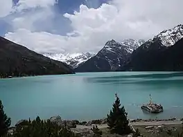 Yihun Lhatso rests in a valley on the north side of the Chola Mountains at the foot of Rongme Ngatra. It is found 10km south of the town of Manigango in Dege County, Garze Prefecture. The lake occupies a u-shaped valley and is contained by the former terminal moraine of a glacier originating from Rongme Ngatra that has now receded to 4,100 m (13,500 ft) above sea level.[1] The lake is drained by the Tro Chu (Chinese: 朝曲; pinyin: Zhāo Qū), a tributary of the Yalong River which eventually joins with the Yangtze. The lake is passed by Highway 317 on its way over Cho La mountain pass.[2]