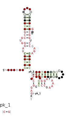 The mini-ykkC RNA motif is a putative cis-regulatory element that apparently regulates similar genes to those regulated by the Guanidine-I riboswitch (ykkC/yxkD leader). However, the mini-ykkC RNA motif is simpler in structure and has fewer highly conserved nucleotide positions than the ykkC-yxkD leader.[5] Despite this each of its two stem-loop structures directly bind free guanidine. Therefore, mini-ykkC RNA motif represents a distinct class of guanidine-sensing RNAs called Guanidine-II riboswitch.[6] Its crystal structure was also determined.[7]