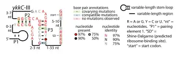 The ykkC-III RNA motif[8] is a distinct candidate cis-regulatory RNA that appears to regulate genes related to the preceding motifs. Although the structure of ykkC-III RNAs does not resemble ykkC/yxkD RNAs, both have a structure complexity that led to the proposal that they represent riboswitches. The ykkC-III motif has a rigidly conserved ACGA sequence within it that resembles a less rigidly conserved ACGA or ACGG sequence found in mini-ykkC RNAs, but it is unknown whether this observation relates to a biological relationship. Biochemical validation has been presented to show that this motif is a third class of guanidine riboswitches called Guanidine-III riboswitch.[9]