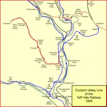 New branches in to the Aberdare valley and the Rhondda were constructed, as well as numerous shorter connections to collieries close to those lines, and near the main line itself.[1][2]