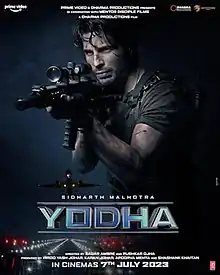 Yodha is an upcoming Hindi language action thriller film directed by Sagar Ambre and Pushkar Ojha. Produced by Karan Johar under Dharma Productions,[1] The film stars Sidharth Malhotra, Disha Patani and Raashii Khanna.[2][3] Yodha is scheduled for theatrical release on 15 September 2023.[4]