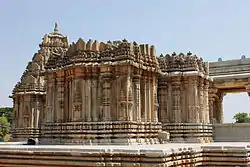 The entrance to the temple is through an open pillared porch (mukhamantapa) followed by a closed mantapa (or navaranga).[4][5] According to Hardy, the eastern side of the temple shows some later additions.[1] The porch consists of an awning supported by lathe turned half pillars and parapets on either side.[6] The closed hall which has no windows connects to the sanctum via a vestibule (called sukhanasi). The vestibule also as a tower (also called sukhanasi) which looks like a low protrusion of the main tower over the shrine. The inner walls of the shrine are square and plain where as the outer walls are semi-stellate (semi-star shaped) with numerous recesses and projections that are used for decorative relief consisting of Aedicula and pilasters. The outer wall of the vestibule is also decorative but is inconspicuous because it appears like a short continuation of the shrine outer wall. The ceiling of the closed hall is supported by four lathe turned pillars which divide the ceiling into nine decorated bays.[7] According to art historian Percy Brown the lathe turned pillars with four brackets above are a characteristic style of the Kalyani Chalukya-Hoysala architecture.[5]