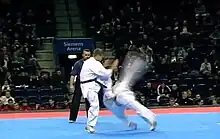 A Yoko Do Mawashi Kaiten Geri (胴廻し回転蹴り),[1][2] also known as a Rolling thunder kick and a Wheel Kick or Side Roll Kick,[1] is a type of kick in full contact Karate, Kickboxing and MMA,[2] traditionally Kyokushin karate, with the particularity that the kick is delivered during a front or side flip, with the back leg swinging from behind and over the practitioner during the flip, aiming for the target's head.