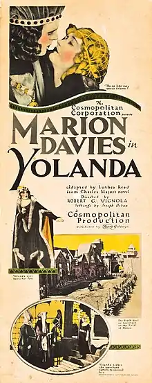 Yolanda is a 1924 American silent historical drama film produced by William Randolph Hearst (through his Cosmopolitan Productions) and starring Marion Davies.[1] Robert G. Vignola directed as he had Enchantment (1921) and several other Davies costume films. The film began production as a Metro-Goldwyn film, with the company becoming Metro-Goldwyn-Mayer in May 1924.[2][3]
