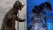 The 1967 Yonggary was originally conceived as a single-celled organism from space that mutated into a giant monster after exposure from radiation during a nuclear bomb test.[7] The 1967 Yonggary was brought to life using a man in a rubber suit. Masao Yagi, who built the Gamera suit for Daiei, supervised the construction of the Yonggary suit.[3] The character was designed in Korea, while the suit was built in Japan based on the Korean design.[8] Director Kim Ki-duk found that the suit lacked terror and was disappointed with the final results but proceeded to film with the suit since there was no time or money to produce a new suit.[9] The suit ended up costing ₩1.2 million ($5,000 in USD) to produce.[10] Cho Kyoung-min portrayed Yonggary, who was paid ₩100,000 ($400 in USD).[2] The film and its title character were produced to rival the success of Toho's Godzilla[11] and the film was released in Germany as Godzilla's Todespranke (Godzilla's Hand of Death).[12] The 1967 Yonggary has a bipedal reptilian design with a long horn on his snout, tusks at the side of his mouth, a single row of dorsal fins, and spikes on the side of his tail. The 1967 Yonggary is capable of breathing fire and his primary food source is oil and gasoline.[13]