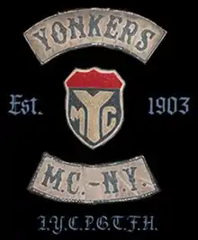 The Yonkers Motorcycle Club originally started as The Yonkers Bicycle Club and was founded on November 19, 1879.[1] The Yonkers Motorcycle Club was formed in 1903 in Yonkers, New York by President George "Usco " Ellis. George Ellis was married January 25, 1916 to Miss Louise Smith of Yonkers. George "USCO" Ellis was appointed State Commissioner for New York of the Federation of American Motorcyclists in August 1915. The Yonkers Motorcycle Club served as a civil defense messenger service during the earlier part of the 1900s delivering messages to various government officials throughout the country. An article taken from the Boston Daily Globe March 11, 1921, titled Cyclists Return After Call on Vice President, describes the journey that George A. Ellis and Henry E Andrews made when they left Boston on a Sunday morning at 9 o'clock am, bearing a message from Gov.Cox to Vice President Coolidge. They completed their first leg of the journey, a distance of 510 miles, in 22 hours and 45 minutes, arriving in Washington Monday morning. They left Washington at 8' o'clock Tuesday morning, and stopped at Ellis' home, Yonkers, en route to Boston.[3] Since 1924, the club has been chartered by the American Motorcyclist Association.[2] The Yonkers Motorcycle Club is the oldest active motorcycle club in the world.