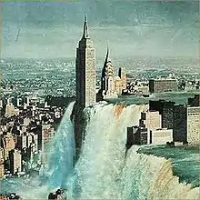 The artwork uses a photomontage by the Japanese artist Tsunehisa Kimura titled The City Welcomes a Fresh Morning, which depicts New York City being engulfed in a waterfall.[12]