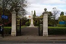When the accounts were reconciled in April 1926, there remained £400 in the memorial fund after Lutyens' fee of £122 and expenses of £20, so the committee commissioned Lutyens to design a set of entrance gates and a pair of supporting piers at the entrance to the memorial garden. The tall, rectangular piers are of limestone construction with cornices and finials in the shape of balls. The gates themselves are iron, painted black and gold, with iron panels linking them to the piers and an overthrow above, in the centre of which is the City of York's coat of arms. The gates open towards the memorial and are aligned with it.[10] To wind up the memorial fund, the committee spent the remaining £17 on three wooden benches for the memorial garden.[8]