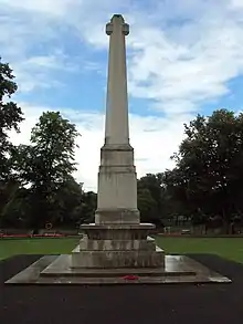Of Portland stone construction, the memorial is in the form of a 33-foot (10-metre) high, lozenge-shaped shaft with short, chamfered arms, moulded where they meet the shaft to form a cross. The cross stands on a base of four uneven rectangular blocks, below which is an undercut square platform, which itself stands on two square blocks. At the very bottom are two wide, shallow steps. The largest block of the base bears the only inscription on the memorial: "TO THE CITIZENS OF YORK 1914 – 1918, 1939 – 1945" on the south face, and "THEIR NAME LIVETH FOR EVERMORE" on the north; the dates of the Second World War were added later.[1][5] As a memento, a bottle, several coins, and a newspaper were placed inside the structure.[8] The memorial stands in a war memorial garden on the south bank of the River Ouse; it overlooks the river and the ruins of St Mary's Abbey on the opposite bank.[1][9]