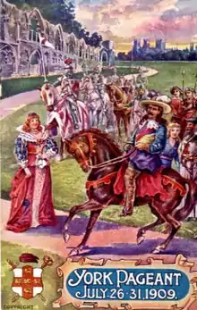 In 1909, the York Historic Pageant included a parade of guild banners accompanying a wagon representing the Nativity through the streets.[7] In December the same year a selection of six plays was performed as a fund-raising venture for St Olave's Church, York.[8] The play cycle was revived on a much larger scale in 1951 in the York Festival of the Arts, part of the Festival of Britain celebrations. It was performed on a fixed stage in the ruins of St Mary's Abbey in the Museum Gardens and directed by E. Martin Browne. The music, written for the occasion by James Brown, was directed by Allan Wicks.[9] The part of Jesus was played by Joseph O'Conor,[10] (although to preserve mystique he was not named in the programme)[11] and other roles were taken by amateurs. In the interests of comprehensibility, the text was abbreviated and modernised[12] by Canon Purvis who went on to lead the Borthwick Institute at the University of York,[13] and produced a modernisation of the complete text.[14]