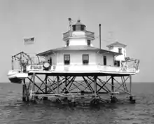 This light replaced lightships stationed at this location beginning in 1853. Extra fender piles were added to the usual six pile structure in order to provide extra stability against the current. In 1903, riprap was placed around the piles for additional protection. A hurricane in September 1933 damaged the light.