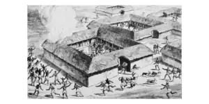 Typical houses consisted of rectangular windowless single-room buildings arranged around a central courtyard ringed by verandas.[3][4] Building styles resembled those of the Ashanti, including construction from earth, wood, palm oil[4] and straw bolstered by timber frameworks and roofed with thatched leaves and wood, or later aluminum and corrugated iron.