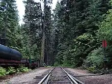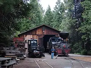 The current railroad follows a portion of grade originally carved into the mountain by the Madera Sugar Pine Lumber Company in the early 20th century. The company originated in 1874, when it was organized as the California Lumber Company to log the area surrounding Oakhurst, California.[3] The Madera Sugar Pine Lumber Company once had a large sawmill at Sugar Pine, California, just south of the current YMSPRR.[4] The railroad had seven locomotives, over 100 log cars, and 140 miles (230 km) of track in the surrounding mountains.[5] In addition to the railroad, the Company also transported lumber in a flume that stretched 54 miles (87 km) from Sugar Pine to Madera, California.[6] This was the most efficient way to transport rough cut lumber out of the mountains for finishing and transport at the bottom of the mountain. The Madera Sugar Pine Lumber Company practiced clearcutting, which removed almost every single tree within the stands of timber surrounding the YMSPRR track. The thick forest surrounding YMSPRR today belies this history, although large stumps from the original old growth timber dot the forest floor lining the tracks.