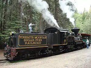 The Yosemite Mountain Sugar Pine Railroad (YMSPRR) is a historic 3 ft (914 mm) narrow gauge railroad with two operating steam train locomotives located near Fish Camp, California, in the Sierra National Forest near the southern entrance to Yosemite National Park.[1] Rudy Stauffer organized the YMSPRR in 1961, utilizing historic railroad track, rolling stock and locomotives to construct a tourist line along the historic route of the Madera Sugar Pine Lumber Company.