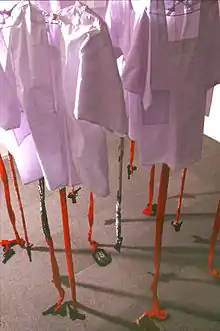 White Aprons (1993) is a triptych in which three different representations of Japanese women protecting their nation during the war are juxtaposed: one highlighting the role of housewife, one showcasing women learning to defend themselves from anti-Japanese attacks in the new Imperial colonies, and one in which members of the Japanese National Defence Women’s Organization see the soldiers off to war.[2] In this triptych, as well as the installation Tied to Apron Strings (1993) that she created and exhibited during this time, Shimada depicted women wearing white aprons, kappōgi, as both a symbol of domesticity and motherhood and as a reminder of the uniform of the Dai Nippon Fujinkai, a Japanese women's patriotic organization formed during the war effort.[2][15]