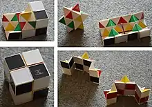 The Yoshimoto Cube is a polyhedral mechanical puzzle toy invented[1] in 1971 by Naoki Yoshimoto (吉本直貴, Yoshimoto Naoki), who discovered that two stellated rhombic dodecahedra could be pieced together into a cube when he was finding different ways he could split a cube equally in half. Yoshimoto first introduced his cube in 1972 at a solo exhibition entitled "From Cube to Space", and later developed three commercial versions. In 1982, Yoshimoto Cube No. 1 was included in the Museum of Modern Art's permanent collection.[2]