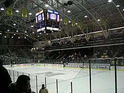 The most recent renovation cost the University of Michigan Athletics Department $16 million and was done by Rossetti Architects.[10][11] The renovation began in the spring of 2012 and was completed in September. The renovation included: ADA accessible seating, new aluminum bench seating throughout, "ice" box seats in the corners of the arena, seat backed premium seating, a new press box, a redesigned concourse with improved concessions, exterior windows and updated lighting and sound systems.[12] These upgrades followed the installation of a new HD video board installed in 2011.[13] Yost Ice Arena's seating was reduced from 6,200 to 5,800, though premium seating was expanded from 300 to 500 and total capacity is approximately 6,600.[14]