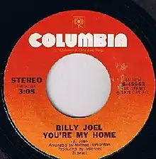 "You're My Home" is a single by Billy Joel. It was originally on Joel's 1973 album Piano Man, and also appears on Songs in the Attic (1981), The Ultimate Collection (2000), The Essential Billy Joel (2001) and 12 Gardens Live (2006). The song appears as a B-side on "Piano Man" and "All My Life" singles. The song was also covered by Helen Reddy on her album Love Song for Jeffrey,[1] which was released as the flipside of her "Keep On Singing" single. It was also recorded by Sami Jo Cole on her album Sami Jo produced by Jimmy Bowen.