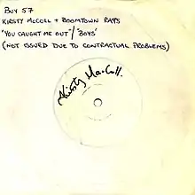After signing to Stiff, Maccoll released her debut single "They Don't Know" in June 1979. The song was a radio hit, but a strike at the label's distributors resulted in the single's failure to enter the UK Singles Chart. Despite the setback, MacColl soon recorded a follow-up, "You Caught Me Out", for which she collaborated with members of the Irish rock band The Boomtown Rats.[1] MacColl co-wrote the song with the band's bassist Pete Briquette and drummer Simon Crowe, and they recorded the track with her, alongside the band's keyboardist Johnnie Fingers. Guitar was provided by Brinsley Schwarz of Brinsley Schwarz.[2]