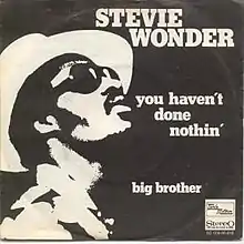"You Haven't Done Nothin" is a 1974 funk single by Stevie Wonder, taken from his album Fulfillingness' First Finale and featuring background vocals by The Jackson 5. The politically aware song became Wonder's fourth Number 1 pop hit and his tenth Number 1 soul hit.[1] It also reached Number 1 in Canada.[2] In the UK the single spent five weeks on the chart, peaking at Number 30.[3]