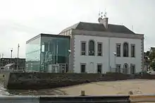 Town Hall – A new Tholsel was erected in 1753 by the corporation, in lieu of that taken down in 1745. It contained an exchange, Council House, Custom House and Grand Jury room. It was situated outside the town walls beside the Water Gate. The town's Water Gate was built in the 13th century to provide access through the town walls to the docks. Also known as Cromwell's Arch, it was from here that Oliver Cromwell left Ireland in 1650, having overwintered in the town after his campaign in Ireland.[12] The Mall itself was used as a fashionable promenade and maintained by the mayor. A military band played there on summer evenings and a play was held every Thursday evening in a little theatre therein. Respectable inhabitants met on the Mall for social interaction every evening after the engagements of the day. The town was frequented by the gentry of counties Cork, Waterford, Limerick and Tipperary. Youghal, in addition to its own yeomanry, was garrisoned by a regiment of German troops and the Wexford militia in 1797. Precautions were taken for the safety of the town causing for hilly areas to be scrapped and made impassable. Gates were erected at both ends of the town and the town hall was converted into occasional prisons and guard rooms. The outlying gentry for the most part came into the town as a place of safety. The Mall House is now used as Youghal's Town Hall.[5]