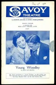 Young Woodley is a 1925 play by the British writer John Van Druten. It concerns a schoolboy at a top British public school who falls in love with his headmaster's wife and is eventually expelled. Because of its negative depiction of public school life, and its controversial subject matter, the play originally was banned in the United Kingdom and only staged in 1928.[1] However, it was a major success in the United States, and Van Druten moved there to work.[2] The ban in Britain was lifted, and the play ran for over 400 performances in the West End, making a star of its lead Frank Lawton. It was revived at the Finborough Theatre, London, in 2007.[3] It was included in Burns Mantle's The Best Plays of 1925-1926.