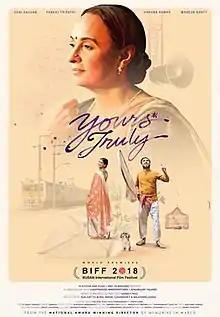 Yours Truly is a 2018 Indian romantic drama film directed by Sanjoy Nag. The film stars Soni Razdan,[2][3] Pankaj Tripathi and Aahana Kumra, with Mahesh Bhatt[4] in a special appearance. It is an official adaptation of one of the stories (The One That Was Announced) from the book LOVE STORIES #1 TO 14 authored by Annie Zaidi [5] and published by HarperCollins. The film is Shiladitya Bora's maiden production under Platoon One Films in association with MDC Filmworks, Lighthouse Innoventures and Basabaari Talkies. The film got acquired by Zee Entertainment Enterprises Limited (ZEEL) and had its world digital premiere on 3 May 2019 on ZEE5.[6][7]