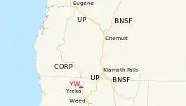 The Yreka Western Railroad Company (reporting mark YW) is a shortline railroad operating freight trains between the Union Pacific Railroad interchange at Montague and the City of Yreka, California.[1] Railmark Holdings acquired the Yreka Western Railroad in 2017.[2]