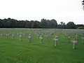The cemetery covers approximately 28 ha (69 acres). Most burials are in individual graves marked by a grey concrete cross that includes (where known) the name, rank, and dates of birth and death. A tall cross stands in the central memorial plaza. Roads extending right and left from the plaza contain a carillon and common graves.