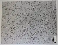 Yttralox is a solid solution of thorium dioxide in yttria.[4] The thorium dioxide additive affects the growth of grains during densification, leading to improved optical transparency. Uncontrolled grain growth allows a few grains to grow larger than the others, trapping pores inside them. The additive increases the grain boundary hardness more than the internal grain hardness.[5] This causes porosity to remain on grain boundaries rather than becoming trapped inside grains, allowing them to be eliminated later in the sintering process. This greatly improves the material's optical transparency, because porosity causes light scattering.[2] Porosities as low as one part per million were reported.[6] The resulting grain size was in the range 10–50 μm.[4]