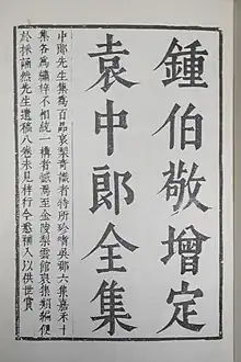 Yuan Hongdao (Chinese: 袁宏道; pinyin: Yuán Hóngdào; Wade–Giles: Yüan Hung-tao, 1568–1610) was a Chinese poet of the Ming Dynasty, and one of the Three Yuan Brothers, along with his brothers Yuan Zongdao and Yuan Zhongdao. Hongdao's life spanned nearly the whole of the Wanli period (1573-1620) in Chinese history. A native of Gong'an in Hukuang, his family had been military officials for generations. Hongdao showed an interest in literature from youth and formed his own literary club at age fifteen. At the age of twenty-four in 1592 he took the jinshi examination and subsequently received an official position in 1595. However he quit out of boredom after a year. He traveled and consulted with the radical philosopher Li Zhi. On another trip his brothers joined him. Hu's elder brother was a Buddhist-Confucianist synchronist. His travels resulted in his publishing a poetry compilation Jietuo ji [Collection of One Released]. His and his two brothers' poetry, which focused on clarity and sincerity, produced a following eventually known as the Gong'an school, the central belief of which was that good writing was a result of genuine emotions and personal experience. When his elder brother Zongdao died in 1600, Hongdao retired to a small island in a lake to meditate and write poetry. The resulting work is Xiaobi tangji [Jade-Green Bamboo Hall Collection].