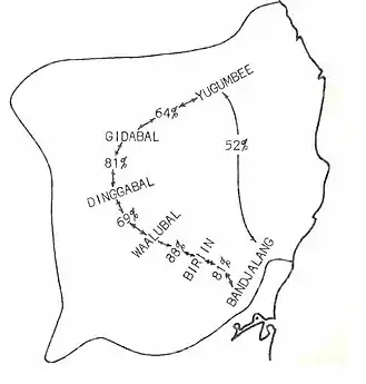 Yugambeh–Bundjalung was historically a dialect continuum consisting of a number of varieties, including Yugambeh, Nganduwal, Minjangbal, Njangbal (Nyangbal), Biriin, Baryulgil, Waalubal, Dinggabal, Wiyabal, Gidabal, Galibal, and Wudjeebal. Language varieties in the group vary in degree of mutual intelligibility, with varieties at different ends of the continuum being mostly unintelligible.[2] These dialects formed four clusters: