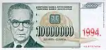 The 1994 dinar (ISO 4217 code: YUG) was the shortest-lived out of all incarnations of Yugoslav currency, as hyperinflation continued to intensify,[4] and only one coin (1 dinar) was issued for it. Towards the end of the 1994 dinar, the National Bank overprinted and reissued 10 million dinara banknotes from the 1992 dinar (right).