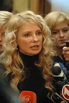 Yulia Volodymyrivna Tymoshenko (Ukrainian: Юлія Володимирівна Тимошенко, IPA: [ˈjul⁽ʲ⁾ijɐ woloˈdɪmɪr⁽ʲ⁾iu̯nɐ tɪmoˈʃɛnko]; née Hrihyan (Грігян);[1] born 27 November 1960) is a Ukrainian politician, people's Deputy of Ukraine (1997–2000, 2002–2005, 2006–2007, 2007, 2014–2019, and since 2019),[2] Vice Prime Minister of Ukraine for the fuel and energy complex (1999–2001), Prime Minister of Ukraine from February to September 2005 and from December 2007 to March 2010. She was the first and so far the only woman to serve as prime minister of Ukraine.[3] She has the degree of Candidate of Economic Sciences.[4]