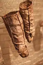 Fish-skin boots (amirak ~ amiraq sg amiriik dual in Yup'ik and Cup'ik) are waterproof skin boot made of fish skin. In the past fish-skin boots were made with depilated soles of bearded seal, ankle straps, and a casing sewn to the upper edge of the leg. Large salmon skins were prepared for boots by sewing up the fin holes. A round needle was used because a triangular needle would split the skin.[7][21]