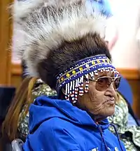 Fancy hat (nacarpiaq in Yup'ik, literally "real hat", nacarpig'ar in Cup'ig) a Yup'ik men's ceremonial headdress (angutet nacait "men's hats") with strips of fur hanging on shoulders or a drummer's hood traditionally used for opening ceremonies and dances. The nacarpiaq is made from bird feet leather, glass and crystal beads, cultured pearls and the skins and furs of wild animals like the mink, land otter, wolf and wolverine. The Yup’ik use animal hide because they believe animals sacrifice themselves in order for the wearer of the garment to survive.[32] Nunivaarmiut Cup'ig men wore caps with many strips of fur hanging from the bottom edge over the neck and shoulders. The main body of these caps, worn at dances, was usually made of squirrel skins with a crown and borders of white reindeer fawn skin. Sometimes a wolverine tail was fastened on the back, and the long bottom fringe might be of reindeer skin strips.[9] Nunivaarmiut Cup'ig wolf head caps, which consisted of an entire head skin including ears and nose, were also worn at ceremonies. Edward S. Curtis (1930) mentions animal-head caps worn during the Messenger Feast.[9]