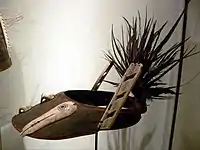 Semi-conical open hunting hat or bentwood visor, wooden visor, hunting visor (elqiaq, ciayaq in Yup'ik and Cup'ik, elqiar, caguyag in Cup'ig, also caguyaq in Sugpiaq ~ Alutiiq, originally borrowed from Aleut ~ Unangan chagudax̂ (Eastern)[39] chaxudax̂ (Western) during the Russian America era) is semi-conical shaped bentwood men's hunting hat decorated with feathers or traditional wooden visor to protect the eyes from the sun's glare, eyeshade. To make a visor a craftsman used hot water to soften the wood, then bent it around and stitched the ends together with sinew, baleen, or split root. Animal carvings were added as hunting charms. Feathers may have been added to assist the transformation of hunters into birds, as described in oral tradition.[36][40][41] The pugugyug (in Cup'ig) is design on caguyar, the legcicuar (in Cup'ig, literally "small gaff") is small gaff attached to caguyar.[16]