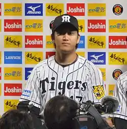 On May 27, he single-handedly pitched a 1-0 complete shutout victory against the Giants, and became the first Hanshin pitcher to record a shutout victory against their arch rivals on his first outing against them.[15] He fell into a slump during the Inter-league games in June, but his previous feats earned him his first ever spot in the mid-season All Star Series where he pitched as a reliever in Game 2.[16] He had a few more shaky starts in the following weeks, but he recovered and became unstoppable in September where he recorded 4 wins with a 0.58 ERA.[17] This won him his first ever Central League MVP of the Month award.[18] He recorded his 10th win on his last start in Koshien, and finished the season with a personal best 10-9 record, 156 strike outs and a 2.90 ERA.[19] He also had a 3-0 record and 0.58 ERA against the Giants, the best among the Tigers pitchers for the season.[20]