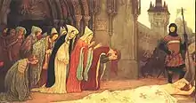 - Felician from the kindred Záh (died 17 April 1330, Visegrád), who attempted to kill Charles I of Hungary and the entire royal family.[3] Elizabeth of Poland, Queen of Hungary was seriously injured in the attack when she tried to protect her sons, princes Louis and Andrew. The members of the royal guard and John Pataki, the deputy master of the stewards for the Queen stopped and killed the assassin.[4] The cause of the assassination attempt is disputed. According to some, the attack was part of the oligarchs' conspiracy. However the historiography accept the words of an Italian chronicler, who remembered the tragic events fifteen years later. Accordingly, Queen Elizabeth's younger brother, Prince Casimir, future King of Poland, allegedly seduced Klara Záh and her father wanted revenge for that.[4]