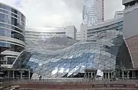 The building investor was ING Real Estate (part of ING Group), and the main contractor was Skanska construction company.[1][5] The complex was mainly designed by California-based architectural firm of Jerde Partnership.[5][6] The building construction was designed by Polish branch of engineer company Ove Arup & Partners, and its electrical installations, by Tebodin.[7][8] The Złote Tarasy shopping centre portion was designed by Poland-based architectural firm of Hrynkiewicz i Synowie Pracownia Architektoniczna.[9], and its glass diagrid roof was designed and build by Waagner-Biro.[10][11] The entire investment costed 1.5 billion Polish złoty.[12]
