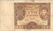 On 15 January 1945 the National Bank of Poland was formed, and a new printing plant opened in Łódź.[31] The series II and III notes were designed by Ryszard Kleczewski and Wacław Borowski. The first three series were taken out of circulation in line with legislation signed on 28 October 1950, covering the introduction of a new złoty with a revived coinage system.[32]