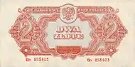 Under the occupation during World War II, the Germans created an Emissary Bank (Bank Emisyjny) in Kraków, as Polish bank officials fled to Paris in France.[27] It started operating on 8 April 1940, and in May old banknotes from 1924 to 1939 were overstamped by the new entity.[28] Money exchange was limited per individual; the limits varied according to the status of the person. The fixed exchange rate was 2 złoty per 1 Reichsmark.[29] A new issue of notes appeared in the years 1940–1941.[30]