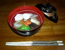 Zōni (雑煮 or ぞうに), often with the honorific "o-" as o-zōni, is a Japanese soup containing mochi rice cakes.[1] The dish is strongly associated with the Japanese New Year and its tradition of osechi ceremonial foods. The preparation of zōni varies both by household and region.[1]