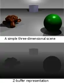 A depth buffer, also known as a z-buffer, is a type of data buffer used in computer graphics to represent depth information of objects in 3D space from a particular perspective. Depth buffers are an aid to rendering a scene to ensure that the correct polygons properly occlude other polygons. Z-buffering was first described in 1974 by Wolfgang Straßer in his PhD thesis on fast algorithms for rendering occluded objects.[1] A similar solution to determining overlapping polygons is the painter's algorithm, which is capable of handling non-opaque scene elements, though at the cost of efficiency and incorrect results.