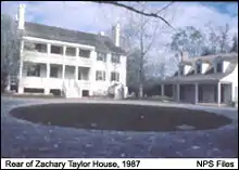 Zachary Taylor's father, Colonel Richard Taylor, purchased a 400-acre (1.6 km2) farm on the Muddy Fork of Beargrass Creek in 1785, while Zachary was eight months old. They initially lived in a log cabin on the property. Commencing in June, 1792, after participating in the constitutional convention that made Kentucky a state, Col. Taylor built a two-story brick house on the land that he purchased from Isaac Shelby. He sold that house to George Rudy on Dec. 1, 1795.[2] During that time, Richard Taylor built a second house at the highest point on his property, dubbing it "Springfield". By 1800 Richard Taylor purchased an additional three hundred acres, making his property 700 acres (2.8 km2) in total. The property was adjacent to Locust Grove, the farm where George Rogers Clark lived from 1809 until his death in 1818. Before he began his military career in 1808, Zachary Taylor lived thirteen years in the house. He would later return to the house to be married on June 18, 1810, and have five of his six children born in the house. In 1829 the house was sold upon Richard Taylor's death, due to debts he had acquired. After his death in 1850, Zachary Taylor was buried in the family cemetery located on the property. This later became the original section of Zachary Taylor National Cemetery.[3][4]
